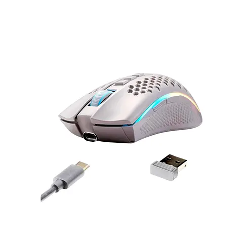 Redragon M808W-KS STORM PRO RGB Wireless Gaming Mouse (White)Â offers dual-mode connectivity, with an instant and absolutely reliable response thanks to its 2.4 GHz wireless system and its removable ultra-light Paracord cable. In addition, it has a superlatively precise Pixart PMW 3335 optical sensor and unsurpassed quality switches from the leading brand Huano, with a durability of approximately 20 million clicks. With its high-capacity battery, you can enjoy up to 36 continuous hours of gaming on a single charge, while its power saving mode optimizes usage time to the maximum. The Storm Pro also features an ultra-fast 1000 Hz/1 ms response, programmable buttons and macro settings through its dedicated software and exquisite RGB Chroma backlighting. Make your game an unbeatable experience with the Storm Pro M808-KS!